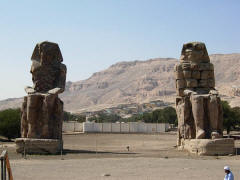 Ils représentent le pharaon assis sur le trône de ses ancêtres, les mains posées sur les genoux ; de chaque côté de ses jambes sont figurées sa mère, Moutemouia, et son épouse, Tiyi. Sur les deux cotés du trône figure une représentation symbolique de l'union de la Haute-Égypte et de la Basse-Égypte, le Sema-Taouy, représenté par deux « Nil » nouant le papyrus et le lys, symboles du « double pays ». Statues monolithiques en granite d'Assouan hautes de 18 mètres (plus de 20 m avec les couronnes aujourd'hui disparues) et d'un poids de plus de 1300 tonnes, ces colosses sont malheureusement fortement endommagés, depuis l'Antiquité déjà. Strabon, historien et géographe grec rapporte que, lors du tremblement de terre qui eut lieu en l'an -27, une grande partie du temple s'écroula et le colosse droit se fissura de l'épaule au bassin.